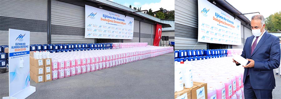 okullara temizlik malzemesi ve dezenfektan desteğinde bulunuluyor.