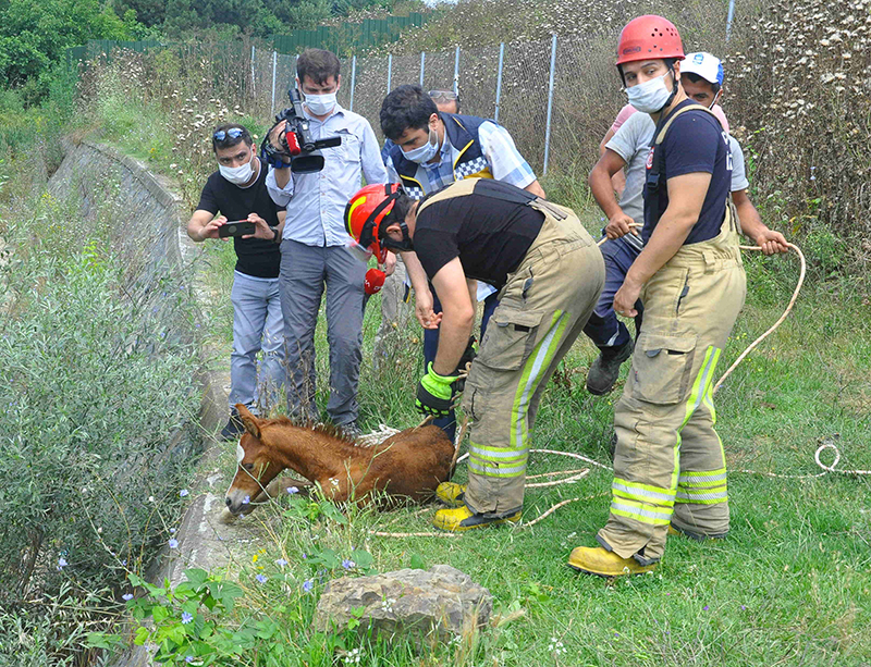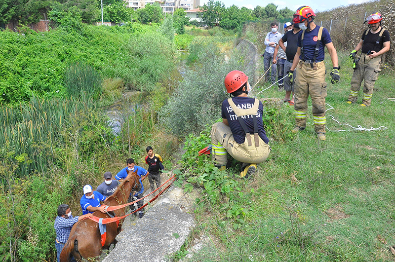 Eyüpsultan Göktürk Kılıncıgöl Sokak'ta dere yatağına düşen at ve yavrusu itfaiye ekiplerinin 1 saat süren operasyonuyla kurtarıldı.