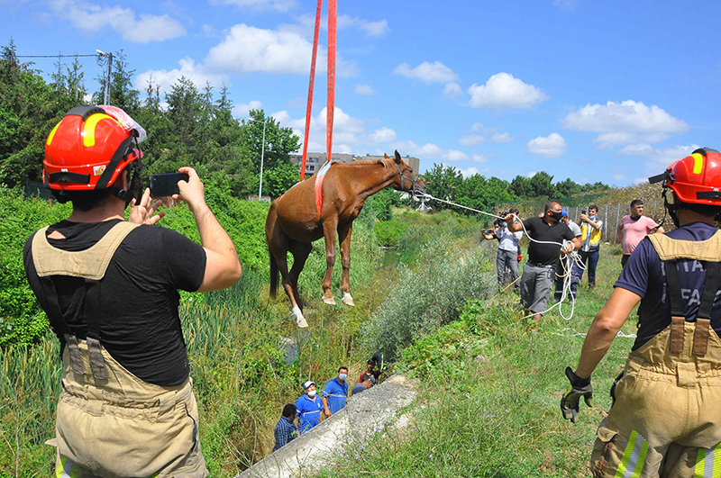 ekipleri başarılı bir kurtarma operasyonunun ardından dere yatağına düşen at ve