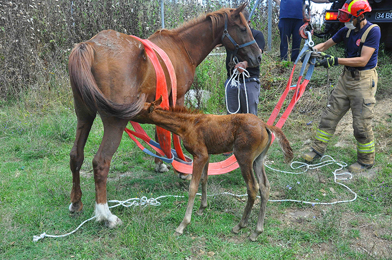 Dere yatağına düşen at ve 1 haftalık yavrusunun itfaiye