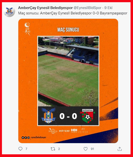 Eynesil Belediyespor sosyal medya hesabı maç sonucunda sahanın görselini
