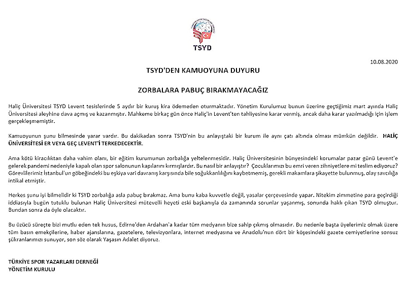 Spor Yazarları Derneği (TSYD), kiracıları Haliç Üniversitesi'nin elemanlarının baskın